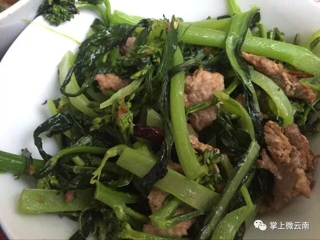 这一道菜基本会在每一家出现,现将菜洗净,将肉丁放入锅中翻炒.,加入盐,再放一点老酒份酱油,先加入根部与茎部与.肉爆炒 .待差不多后. 放入菜叶 、新鲜辣椒,按顺序. 放盐等佐料,最后放一勺味精即可出锅。