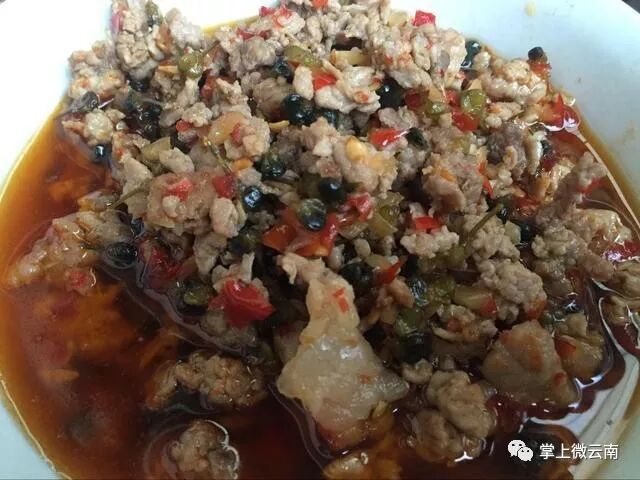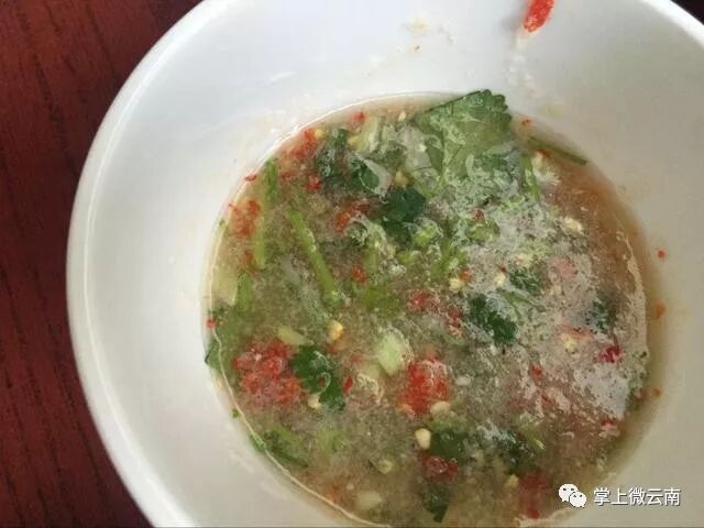 对于云南人来说,无论你是吃烧烤,还是日常的食物,各种口味的蘸水是一定少不了的。在杀猪饭的佳肴里,蘸水让一些菜更添美味,蘸水的主旋律还是香辣,炒好的糊辣子面,或者小米辣,舀上一点放在小碗里。放点蒜末葱花乳腐等等佐料,有些人喜欢加开水,有些人喜欢加蒜油,吃法看个人爱好,通常在当地,白肉和蘸水就最佳拍档。
