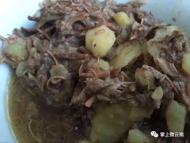 云南人是出了名的喜欢吃洋芋,平常洋芋可以凉拌着吃,油炸着吃,烤着吃。在杀猪饭的佳肴里,一定少不了洋芋的身影,洋芋焖肉是很多人家的美味。土豆去皮切块,放入盘中待用,猪肉切片或条,放入佐料腌制一会,入味,加其他小料,盖上锅盖焖,香味诱人。