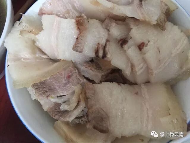 白肉在很多地方都有,云南人喜欢蘸当地非常特别的蘸水吃,在一些地方白肉是对肥肉的称呼,同时也是营养学上对肌肉纤维细腻、脂肪含量较低,或许平时你吃到的白肉有些油腻,而在杀猪饭上遇到的白肉通常肥而不腻,咬下去口留肉香。