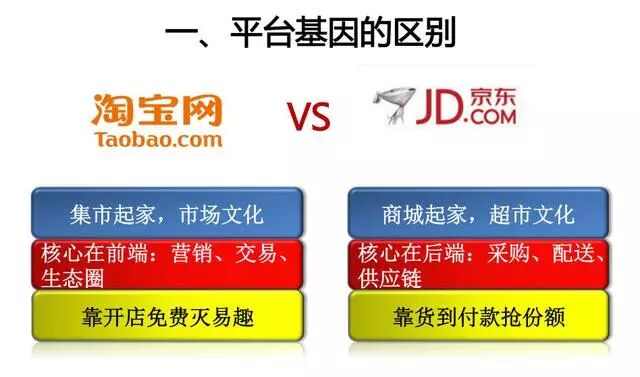 了解平台的核心竞争力,目的在于把他们的核心竞争力给利用起来:比如在淘宝就一定要用好每一次淘宝的大促活动,而在京东则一定要用好京东的货到付款模式和物流体系。第三再对比一下平台的核心资源,基本上所有电商平台的资源,都可以分为四大类,自然流量、广告流量、活动大促、特卖频道。自然流量,主要是搜索流量和类目流量,无论淘宝还是京东,都有自己独特的搜索规则,研究这些规则,利用这些规则,就是一个关键。广告流量,淘宝更加成熟些,钻石展位、直通车、淘宝客,三大类广告都可以在后台自行购买;大促方面,淘宝有双11双12,京东则有618;特卖频道,淘宝最典型的是聚划算,然后还有淘金币、天天特价等,当然手机淘宝上最热的是淘抢购;京东也有京东团购、京东闪购、今日推荐等特卖频道。研究好这些资源,利用好这些资源,就是入驻了某类渠道后完成“本土化运营”的关键任务。