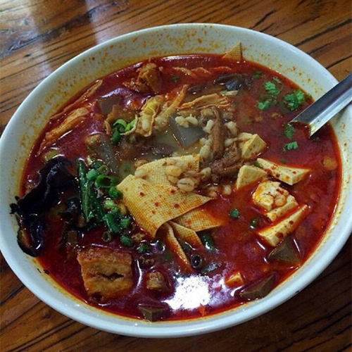 在西安泡馍界最豪华的当属三鲜煮馍里的三鲜戴帽了,本身三鲜煮馍里就配有丸子、五花肉、响皮,再来个莲菜炒肉片或者辣子鸡丁盖在上面,超级美气,不愧是老陕泡馍中的战斗机。
