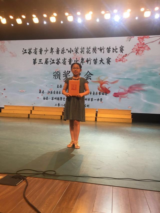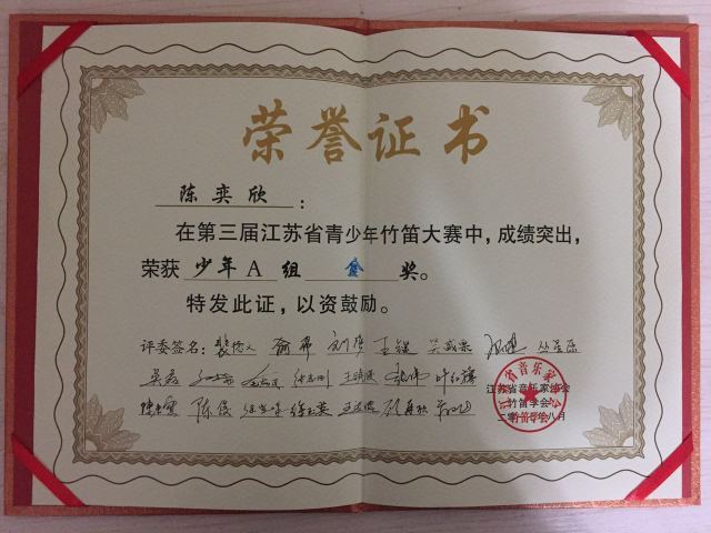 2017年8月荣获第三届江苏省青少年竹笛大赛少年A组金奖。