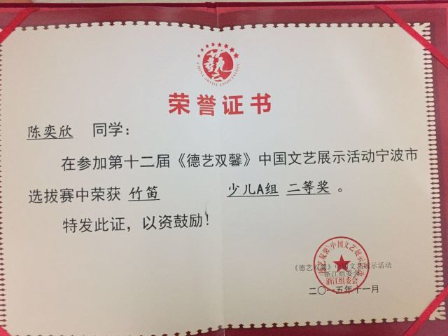 2015年7月参加第十届《中国青少年艺术节》宁波选拔赛少儿A组二等奖