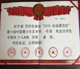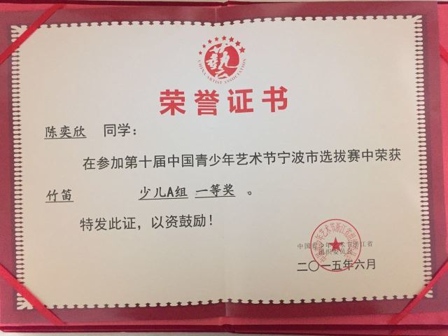2015年7月参加第十届《中国青少年艺术节》宁波选拔赛荣获少儿A组一等奖
