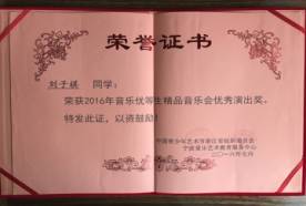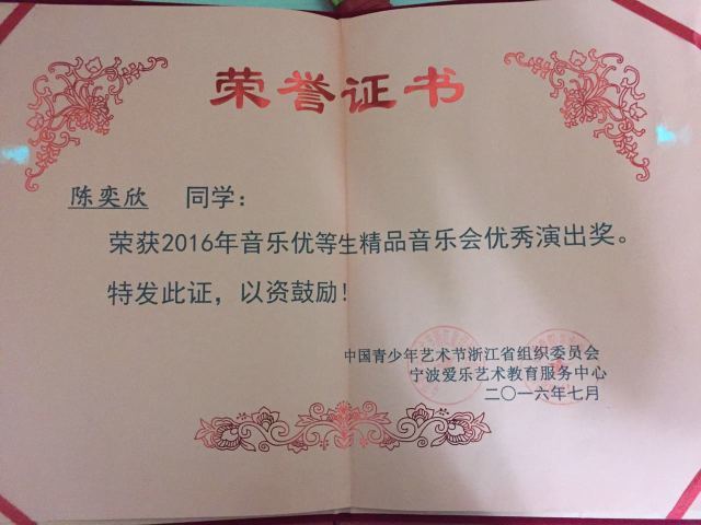 2016年7月在宁波音乐厅举行的音乐优等生精品音乐会中荣获优秀演出奖。