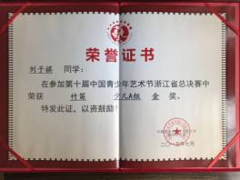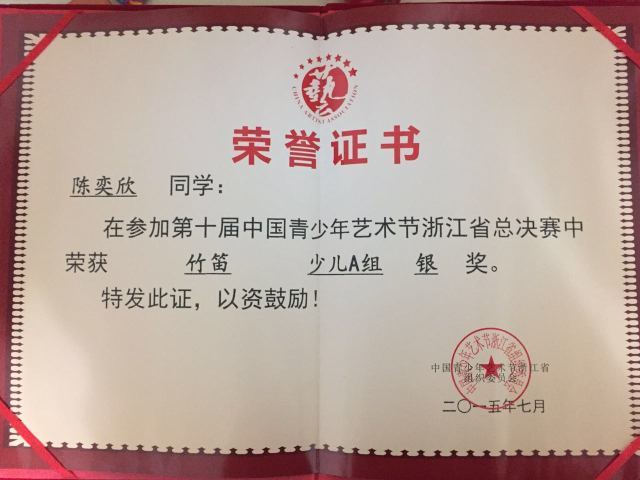 2015年7月参加第十届中国青少年艺术节宁波市选拔赛荣获少儿A组一等奖,浙江省总决赛银奖。