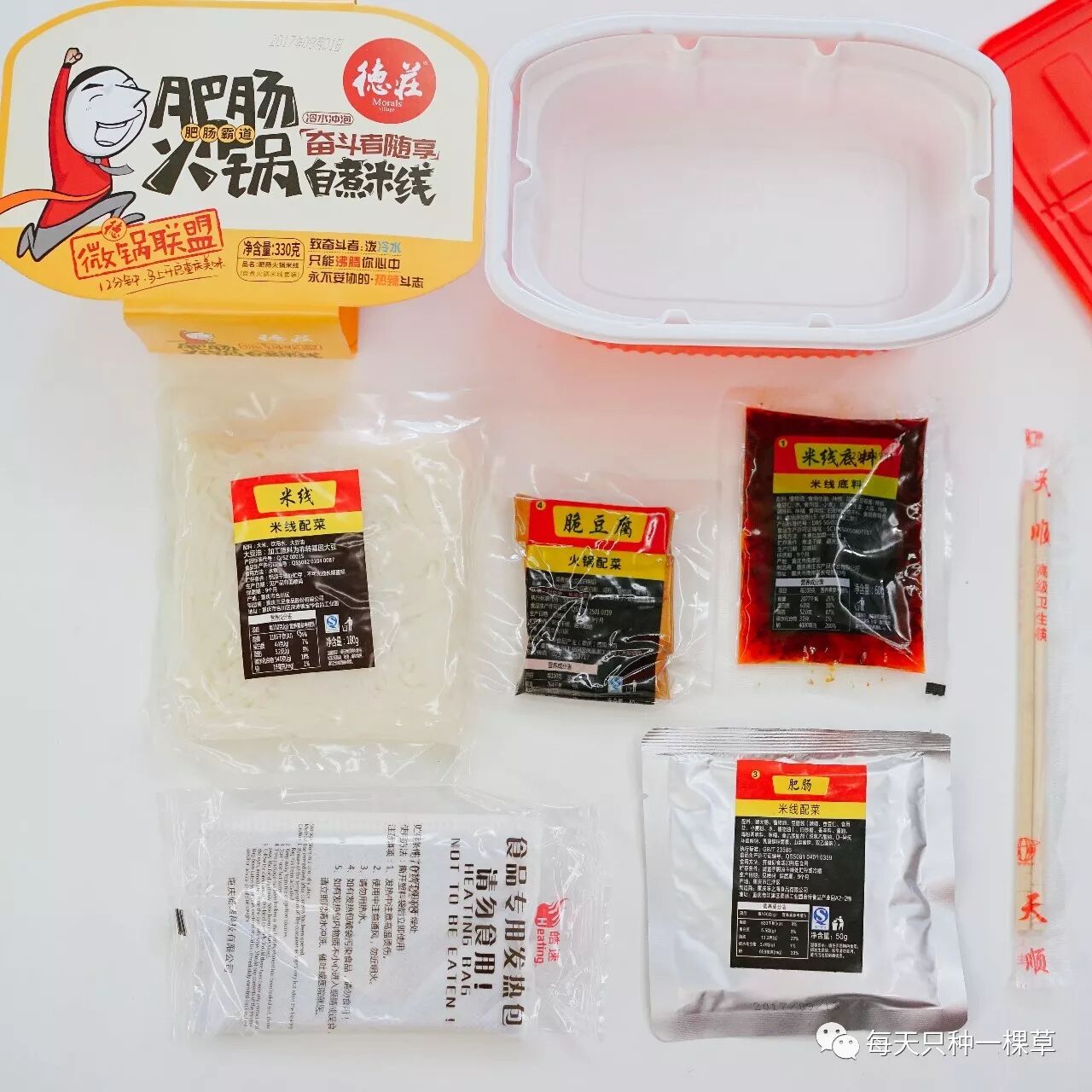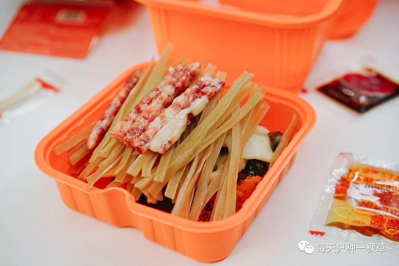 包装盒和小龙坎的差不多,也是便当款的,但是盒子的质量是这几款里面最差的,特别软,移动起来极其不方便。里面的东西也比较简单 粉条,肥肠包,豆干,自热包~连筷子质感超差!