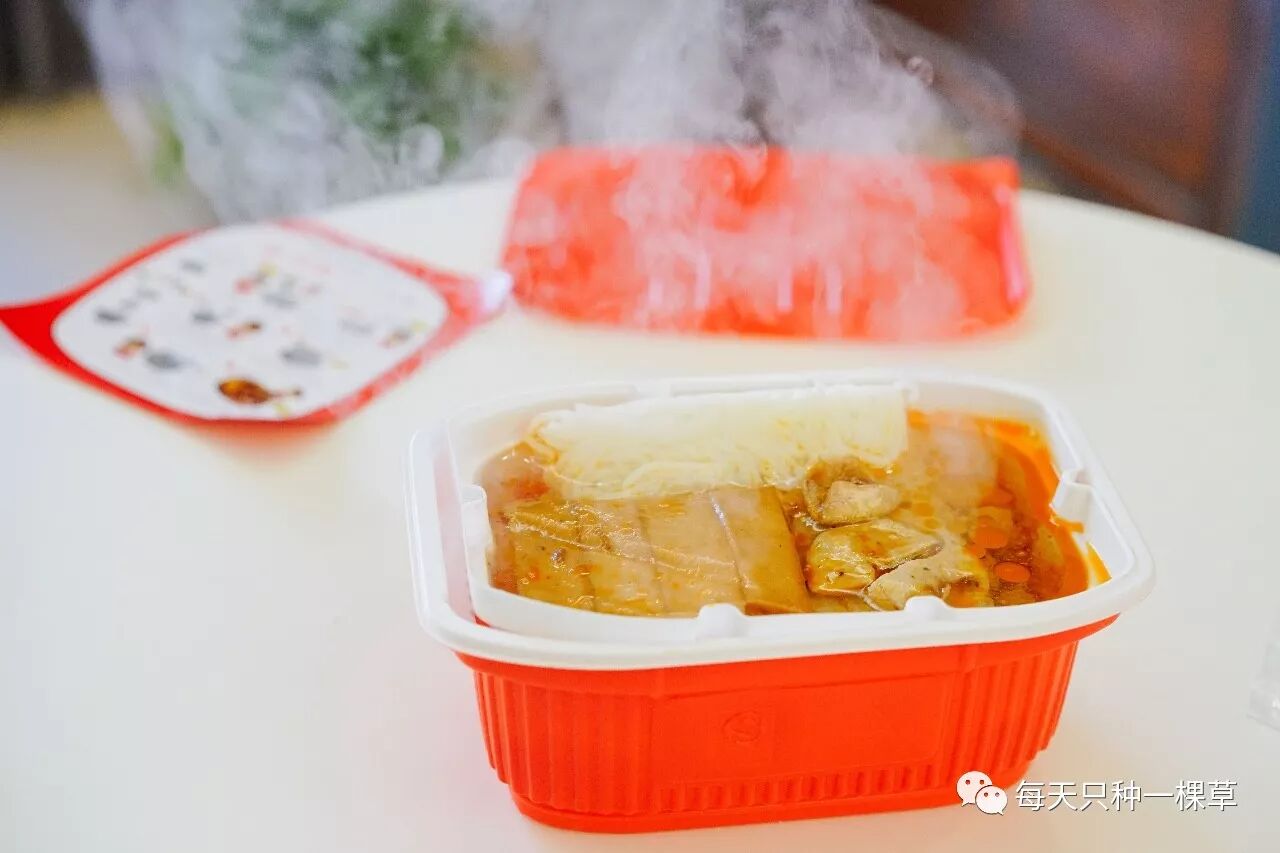 大部分的懒人火锅都是一个酱料包,几个菜包,还有一个发热包。它的原理很简单,就是靠发热包遇冷水变热,把食物加热。注意加热包一定不可以打开,要带着包装!