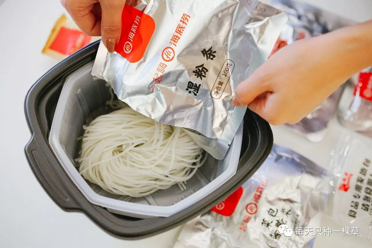 包装也是四方形的。盒子的材质比海底捞的要薄一些,不过也蛮结实的。里面一共7个小包加1个自热包。分别的是火锅底料,素菜,肉,粉皮,比海底捞多了一包小腊肠。还配送了2个调味包,一个芝麻油一个醋,从配料上看,好感度满分~