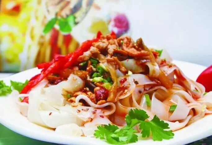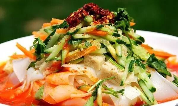 凉皮2张,香菜2根,盐0.25小匙,陈醋0.5大匙,辣椒油适量,芝麻酱2小匙,油炸花生适量。