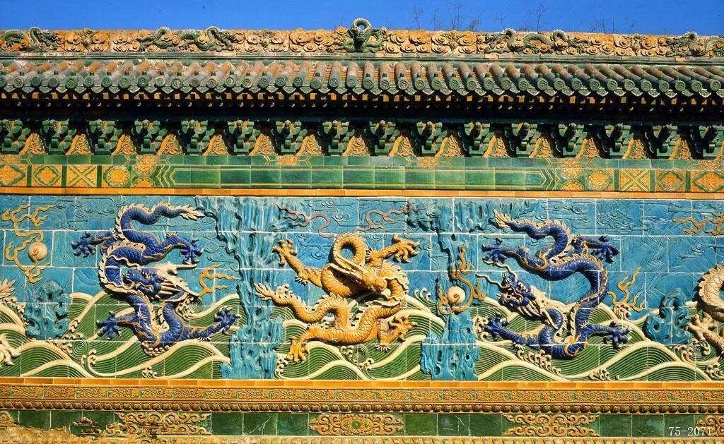 离仿膳不远的地方有个九龙壁,这是一面大照墙,墙的上部用金黄色的琉璃瓦镶嵌着九个飞龙,那飞龙的神气与色泽,栩xǔ栩xǔ欲yù生shēnɡ。据说,某国的古董商拟出巨资把这个九龙壁买去,幸亏这事情只是一种传说,始终没有成为事实,否则北海公园将黯然失色了。