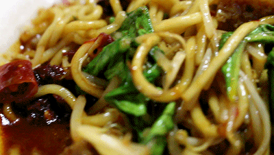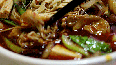这时老板过来,好吃吗?我嘴里塞着食物,只顾着点头,老板说,我们家的香辣面独特之处有两点: