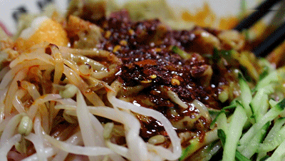 黄瓜豆芽负责提供爽脆的口感,面筋是做面皮附生出来的,非常筋有嚼头