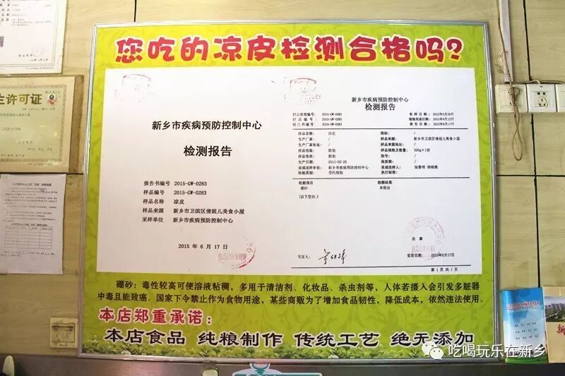 老板介绍,她家的凉皮特点是薄、软、筋、香,采用纯粮制作,并且多年以来一直沿用传统老工艺制作,不添加硼砂和胶,为此,还专门做了鉴定!