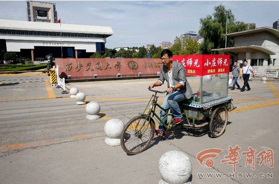 西安交通大学南门对面的金水路路口,一个名为“小庄师兄”的凉皮摊位吸引了市民张先生的注意。这个只有一辆生锈的三轮车、一张案板、一把遮阳伞、一张桌子、4个凳子的摊位,却拥有一名“英语口语很棒”的老板。