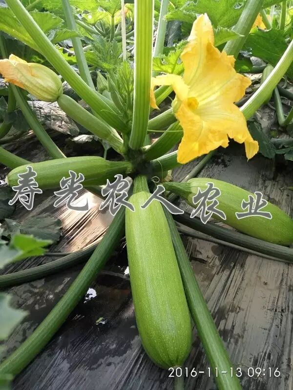 法国引进最新成熟高抗病、耐寒西葫芦新品种,早熟;植株长势旺盛,根系发达,耐低温弱光,低温条件下不歇瓜;抗病性极强,高抗白粉病,较抗病毒病,抗逆性强,适应性广;瓜条油绿,顺直,呈长棒形,瓜长25-28厘米,横径6-7厘米,商品性极好;节层性好,成瓜率高,连续坐瓜能力强,膨瓜速度快,产量高超,生育期可达300多天,正常管理情况下六月底前不会出现植株早衰现象。适合北方温室越冬、早春拱棚栽培。建议株行距80*100,亩栽900-1000株。