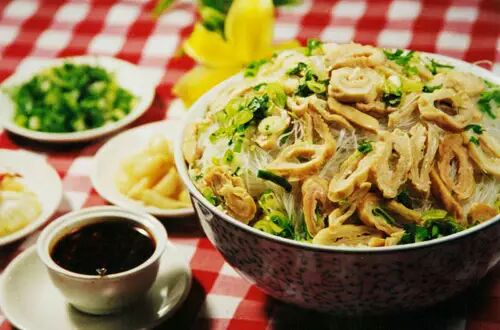 打卤汁和凉粉一起吃的叫卤汁凉粉。这种美食最初出处据说是陕西省长安县。夏季炎热正赶上农忙季节,农民无暇做饭,热饭吃起来又占用时间,打一锅卤,切一点凉粉,佐以方便调料,泡一些馍,稀里哗啦几口一刨,一顿饭即了之,爽口惬意,美不胜言,这样就逐渐形成了这个具有陕西特色的汉族风味小吃。