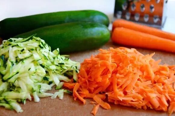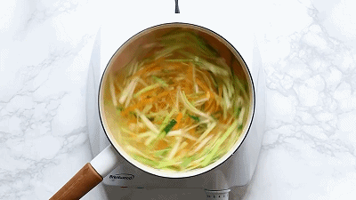 先将胡萝卜、西葫芦、西蓝花根茎刨成细丝,然后放入锅中焯水,待菜丝变软,便可捞出。