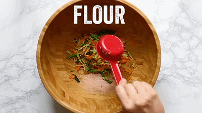 将切好的菜放入碗中,依次加入少量的盐、黑胡椒粉、葱花,面粉适量,最后倒入调好的鸡蛋液,混合搅拌均匀。