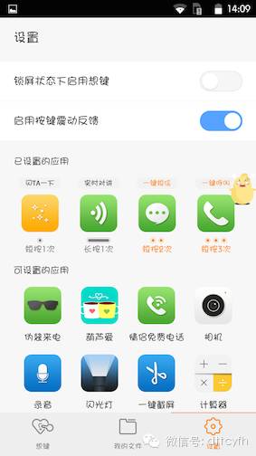 这次在葫芦手机的机身顶部还有一大亮点就是,突出的圆点状实体按键,这也是葫芦手机情感元素之一。该键为Fanskey键,中文名字“想键”,可以实现一键传情,通过Fanskey键可实现熄屏拍照的功能。只需一键设置,短按两下和短按三下都可以进行自定义,如可定义为打开照相机,伪装来电,一键截屏,一键报警等功能。实用起来方便快捷,可谓是给到了用户更好的使用体验。