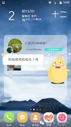 锁屏头像,全球首创桌面显示两人头像功能。在锁屏状态下,桌面显示大小两个头像,大头像为对方头像,小头像为自己头像,充分体现了葫芦情侣手机相亲相爱的主旨。