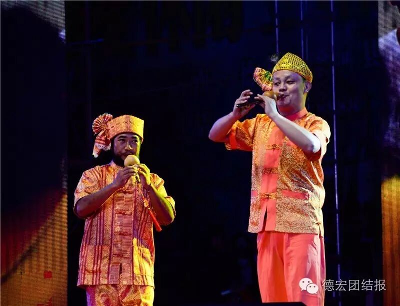国家一级演员、著名演奏家郑强老师以及梁河县葫芦丝著名演奏家哏从国老师带来葫芦丝合奏《欢乐泼水节》,舞蹈展现了傣家人们的热情好客。