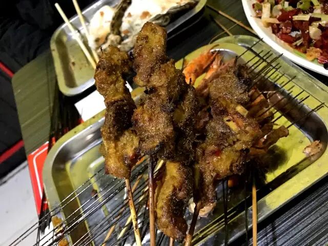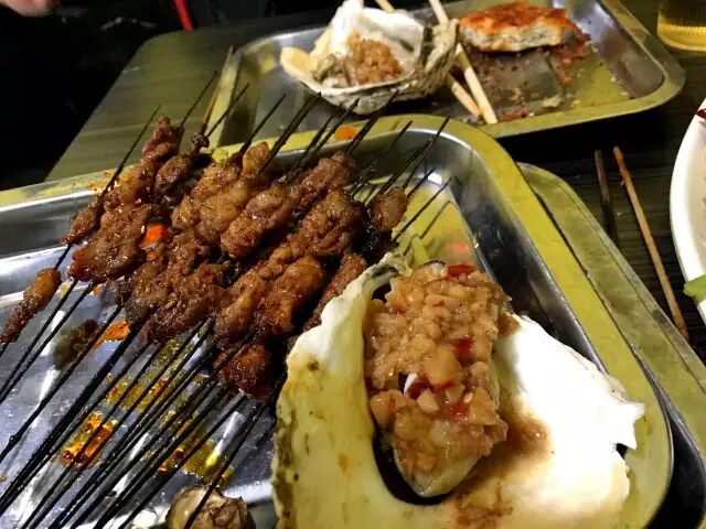 烤生蚝、扇贝、腰子、瘦肉、筋儿、香仔肠、油馍。