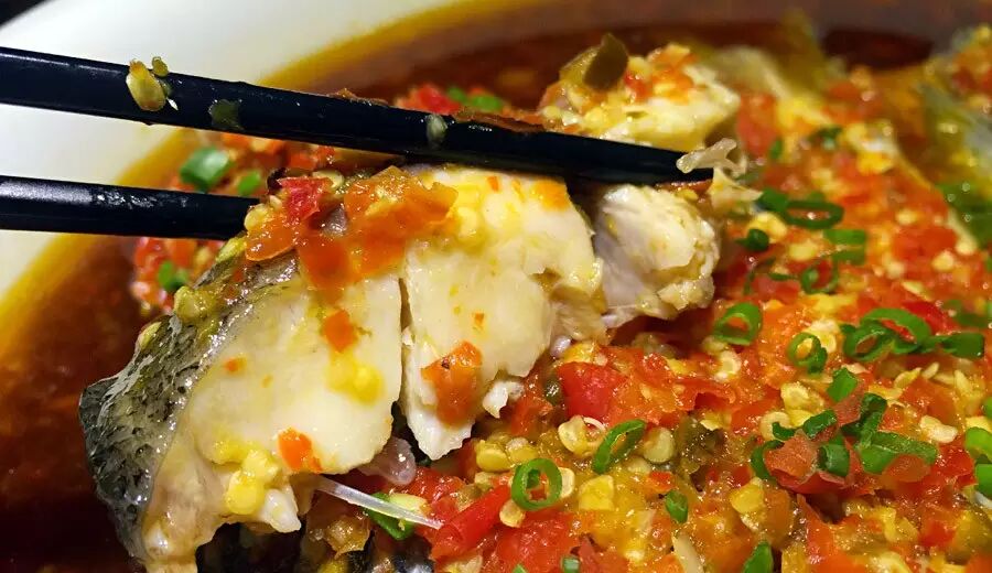 菜单翻开一看,原来这家店是来自湖南的湘铁牛鱼头泡饼,是传统的湖南剁椒鱼头的新吃法,红绿泡椒浇满鱼头蒸熟,鱼鲜嫩味香辣,与我们平常吃到的鱼头完全不同,吃起来一点也不油腻。