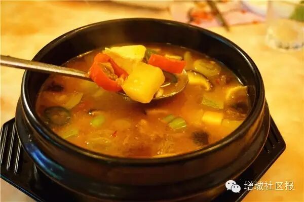 大酱汤:在韩国,大酱汤是日常餐桌上必不可少的一道传统菜品。汤里没有油,没有肉,热量蛮低,煮出来的汤水味道偏咸偏浓郁一些。