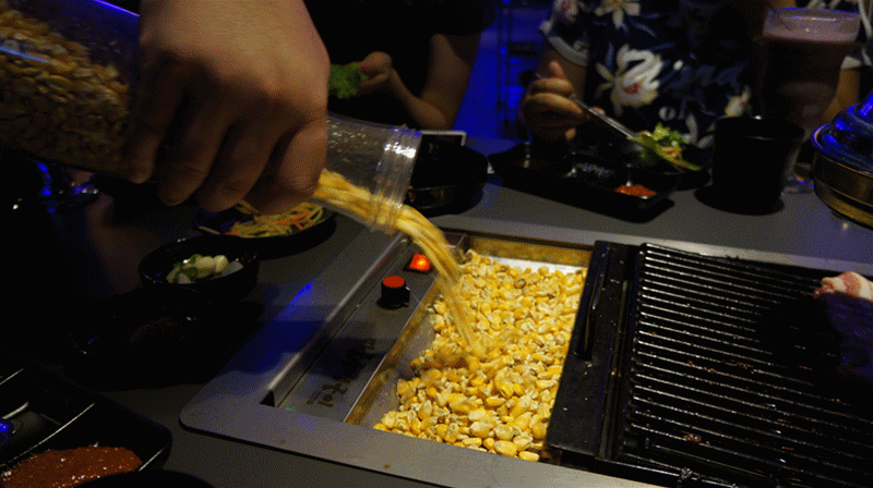 是麻浦拳头玉米烤肉集吃、玩、闲、乐于一体的一大特色