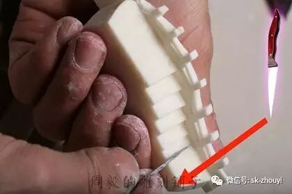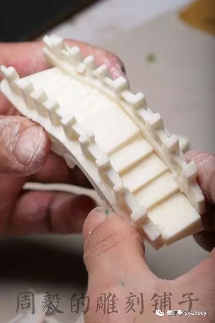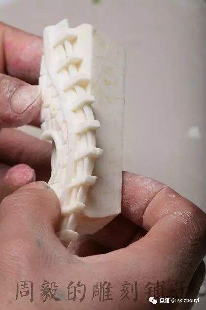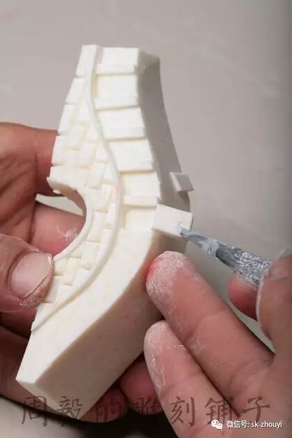 主刀依次刻出桥墙体的细砖,注意两行之间要错开