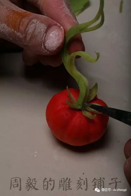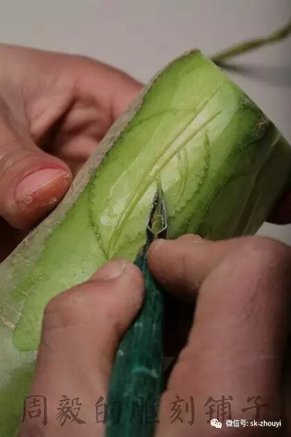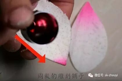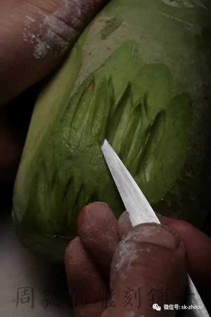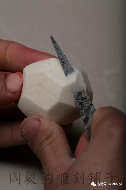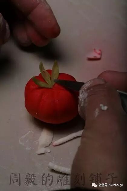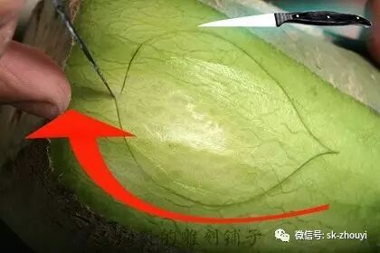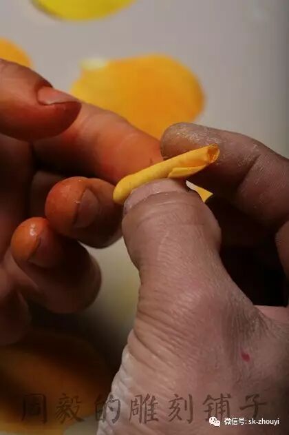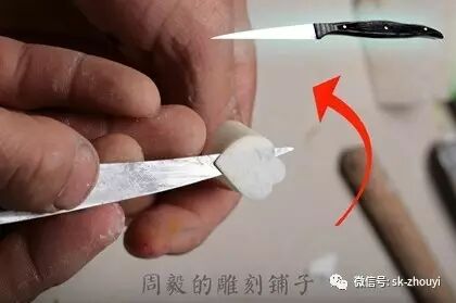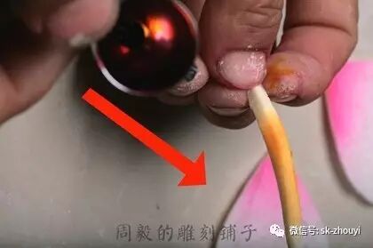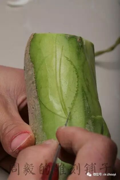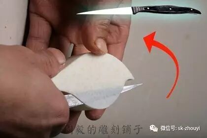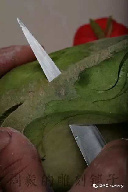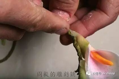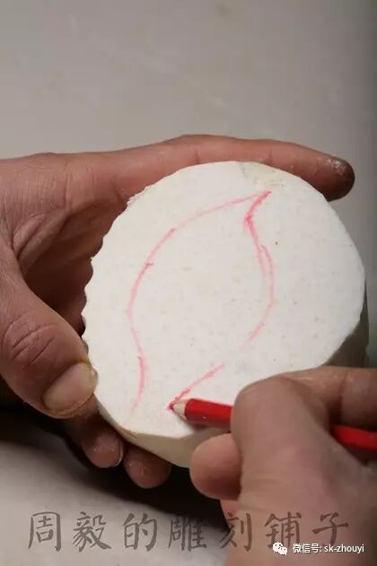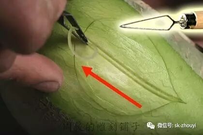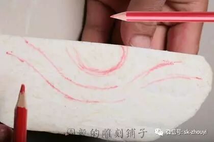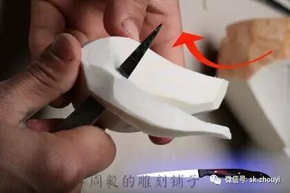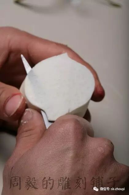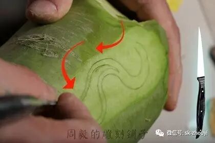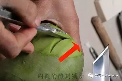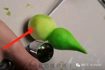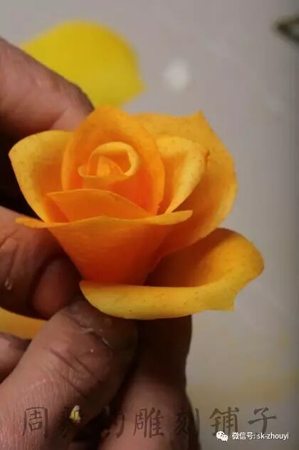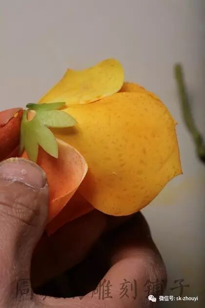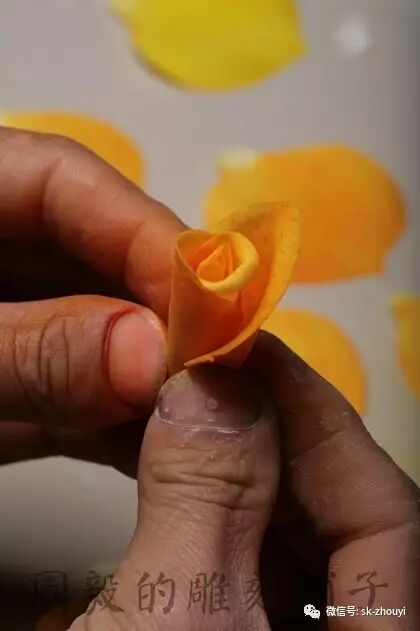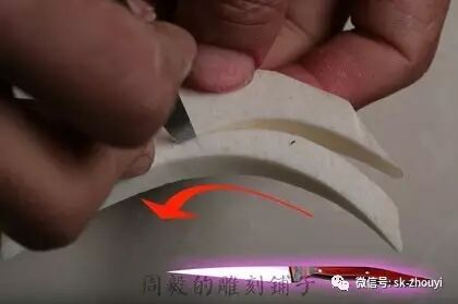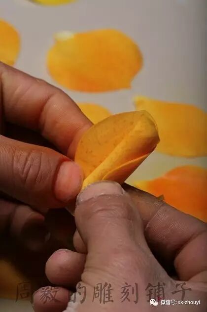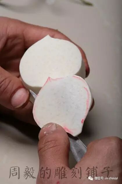用果树雕刻专用画笔画出玫瑰花瓣的大形,手刀切片,注意上后下