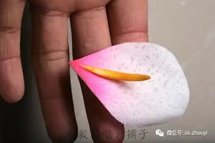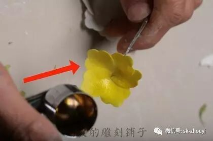 另取小块芋头,主刀取出花瓣大形,并依次刻出花瓣。