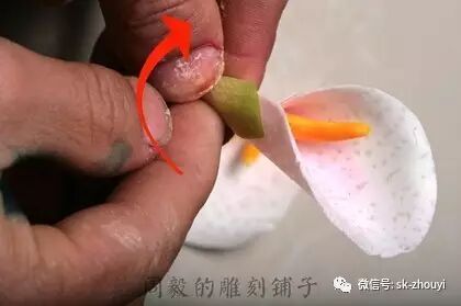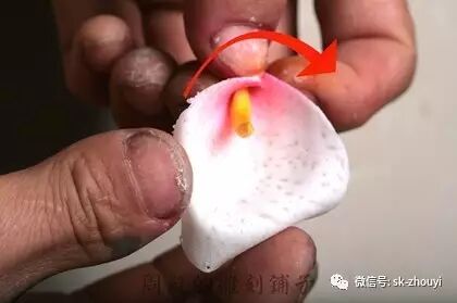小喷枪装上橘红色素,喷洒于马蹄莲花蕊。