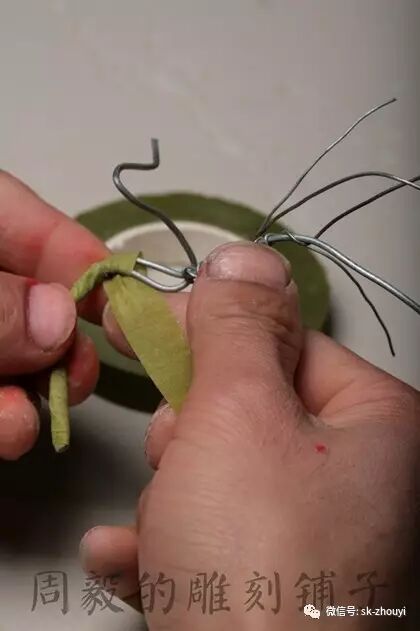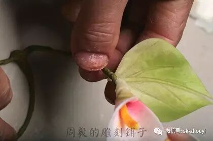 另取青萝卜薄片作为花托粘接在马蹄莲根部。