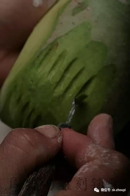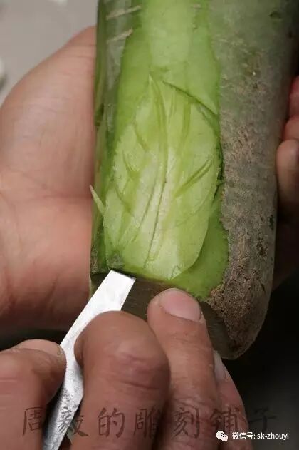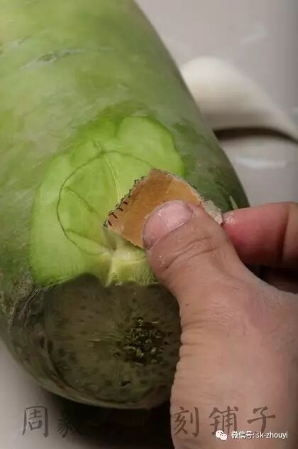 中号掏刀依次在青萝卜上掏出长条凹槽。