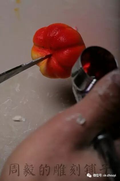 小喷枪装上红色素,均匀喷洒于西红柿。