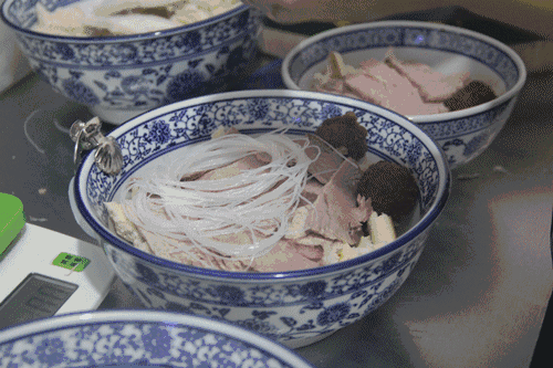 掰馍也是有讲究的,先掰一分为二、二分为四,掰成八小块。馍太大会夹生,太小也会没有口感,然后掐,将馍掐成拇指盖大小的就行了,便于汤汁的五味入馍。最后是抖,将掐好的馍块抖落均匀,互不粘连,然后交给服务员,五分钟就差不多好了!