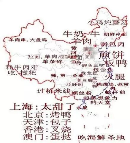 当然了,这幅充满作者个人倾向的“原始”吃货地图也在广大网友中引起热议。有人说:“上海太甜,那苏州和无锡人民咋办? 不准!吃海鲜的圣地是环渤海一带,冷水的海鲜好吃,我爸说南方的海鲜没青岛大连的鲜!”自此之后,全国网友脑洞大开,出现了各种千奇百怪的“升级版”天朝美食地图。