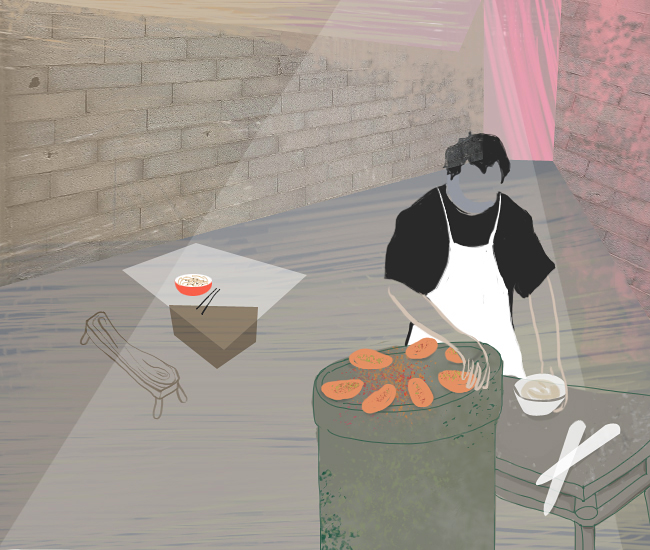 等待锅盔酥脆的空档,先去隔壁店里点一碗酸辣粉。绵长筋斗的红薯粉装在竹篓里,放进一口两米大锅,锅里翻腾的是熬制了数个小时的肥肠高汤。三五分钟后起锅,老板淋上酱油、醋、熟油辣椒、花椒、大头菜粒和炸黄豆端到你面前。这边锅盔也已出炉,一层层的面皮金黄油亮,咬下一口,先是酥皮的脆,接着一些油份渗出面皮滋润唇舌,然后是花椒和牛肉混合的气息填满口腔。一边吃着锅盔,再一边夹起酸辣粉往嘴里送,柔软的粉条和陈醋的浓香,终于让连日来迷失方向的游子醒了过来。