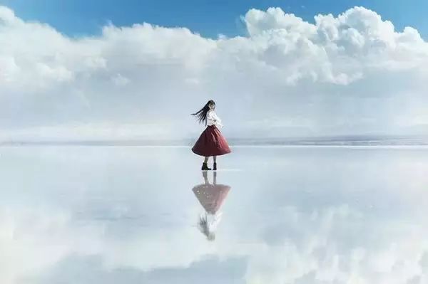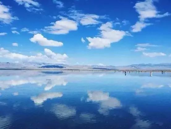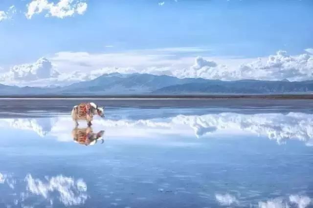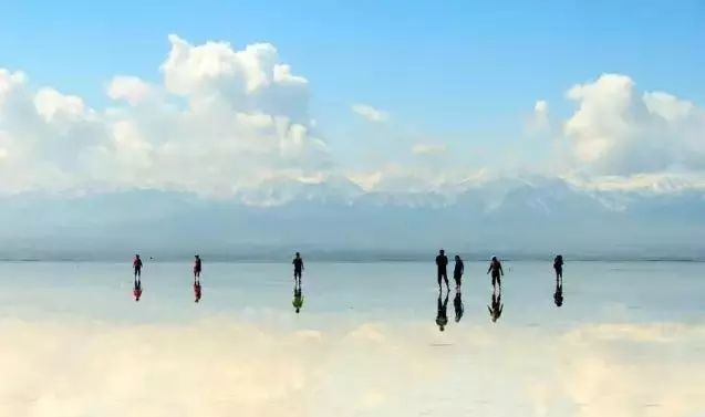 湖水含盐量很大,可以直接走在湖面上。自然结晶成为了一片白色的湖面,将天空、云朵和对岸的山都倒映在湖里。水与天已没有明显的界限,天是湖的一部分,湖是天的补充,似真似幻!
