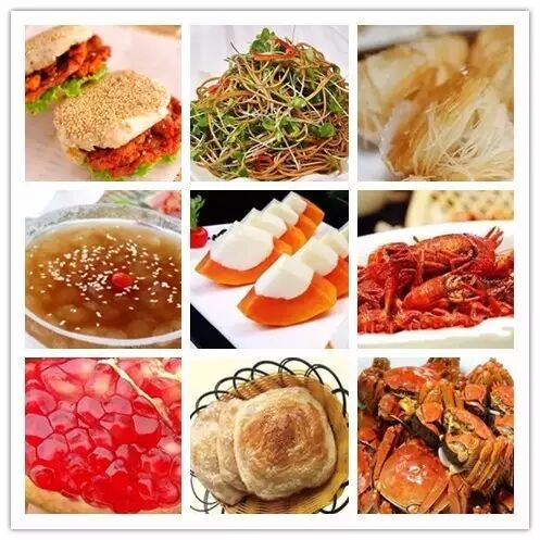 美食:烧饼夹里脊、五香豆腐丝、盘丝饼、水晶冰、鲜奶冻、大蚂虾、蚌埠石榴、沱湖螃蟹...