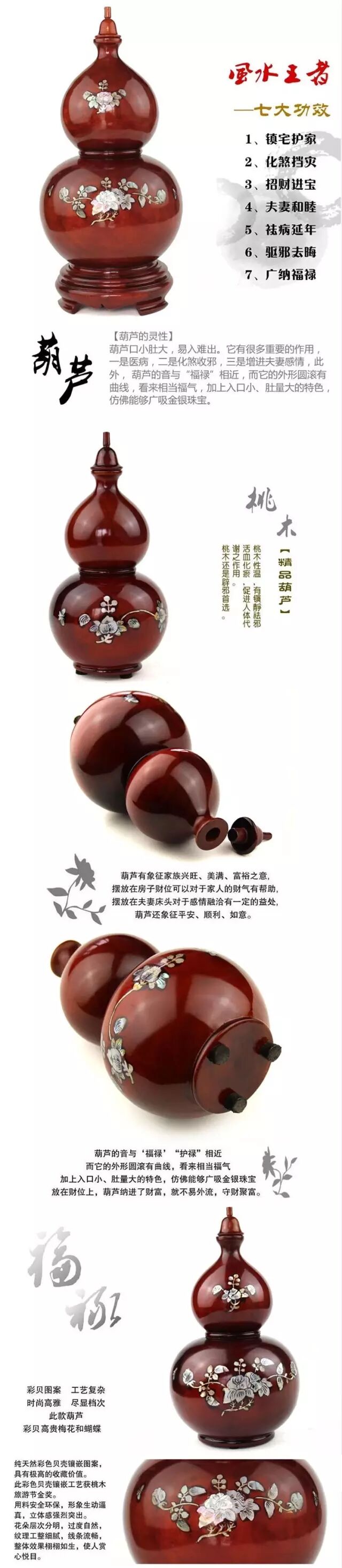 葫芦用作除病之用,只须挂在病者的睡床尾或摆放在病者的睡侧。就可以吸取病人身上的病气,使其快速的好起来,如果是健康人,可以吸走人身上的晦气,提升运势。葫芦挂在大门外,则有保屋内人平安的作用。