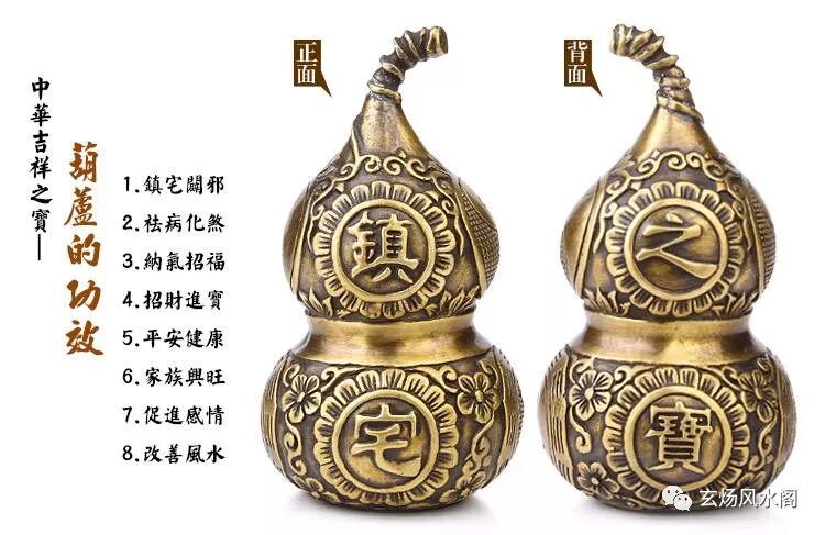2.铜葫芦可以增加夫妻缘分, 促进家庭和睦,加强生育能力。若夫妻缘薄,同床异梦,不妨摆放三只铜葫芦在床头或置于宅居吉位。增加夫妻恩爱。铜葫芦具有神奇的化病灾、强身健体、增益健康之功效。在玄空风水术中,二黑和五黄是病符星,要是飞到门上或中宫,家人会无缘无故地犯病遭灾,这时候铜葫芦就派上大用场了。二黑五行属土,用金化解,铜葫芦属金,金可以消化土,葫芦又能化病,一物二用,效果极佳。是化解二黑并非煞的不二之选!配合一串五帝钱使用效果会更加好。