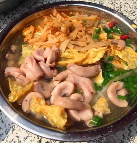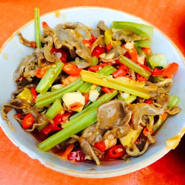 配菜大爱腐竹和猪小肠,他家的辣椒也很有特色,一罐油泼辣子,一罐醋泡尖椒,纯辣酸辣任你选。