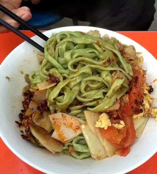 又是一个隐蔽的美食,陕西人就是爱吃面,坤坤菠菜面的店面不大,名气却不小,他家面是手工菠菜面,标准老陕口味。