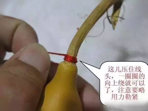 用长的线,绕龙头向上缠,把短线头压住。注意略用力勒紧点儿。