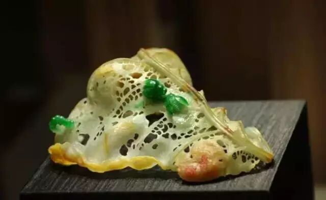 故宫收藏的慈禧太后最喜欢的一件作品,材质是冰种带彩翡翠。这是一张枯萎的荷叶,生于淤泥而一身清净无染。秋荷波动曲折,露珠晶莹滚滚。
