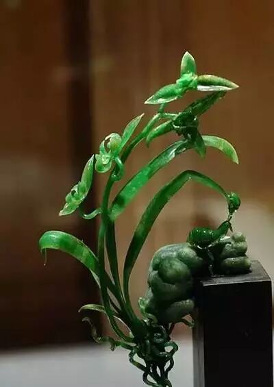 这是一块原本10公斤重的老坑种翡翠原石,硬是被雕琢成了一片片悬空的兰叶。坚硬的翡翠化成了柔软的线条,什么叫做不惜工本哪!